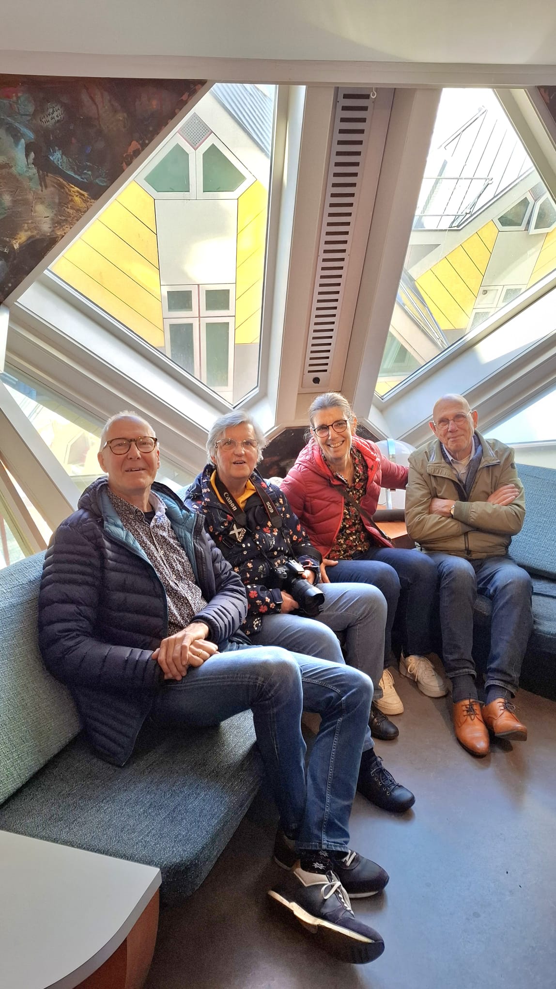 Op dinsdag 14 april bezochten we met vier gemeenteleden de Kijk‑Kubus. Het is een van de bekende kubuswoningen die als museum is opengesteld voor publiek. De kubuswoningen werden begin jaren tachtig ontworpen door architect Piet Blom. Zijn idee was om een soort “dorp in de stad” te creëren: iedere woning stelt een boom voor en samen vormen ze het Blaakse Bos. De kubussen staan schuin, als het ware op hun punt, op een betonnen paal. Dat ziet er van buiten al bijzonder uit, maar van binnen ervaar je pas echt hoe anders het wonen hier is. Door de schuine wanden moet je creatief omgaan met ruimte, maar is ook een speels en verrassend. Wat ons het meest verbaasde: er woont daadwerkelijk iemand in de Kijk‑Kubus. En dat terwijl er elke dag, tussen elf uur ’s morgens en vijf uur ’s middags, hordes toeristen door zijn huis wandelen. Dat vraagt toch wel wat aanpassingsvermogen. Maar goed, het is ook een leuke bron van inkomsten.